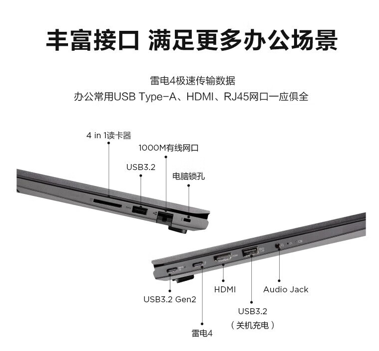 7、接口:2*USB3.2G1、2*TYPE-C3.2G2、HDMI、RJ45、 四合一讀卡器、comboaudio